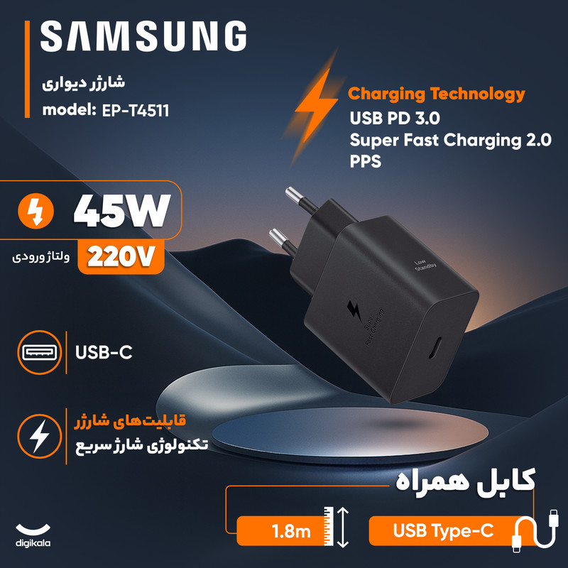 شارژر دیواری 45 وات سامسونگ مدل EP-T4510 Low Standby به همراه کابل USB-C به طول 1.8 متر