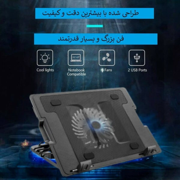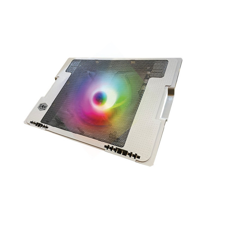 پایه خنک کننده تنظیم ارتفاع دار لپ تاپ مدل 738G محصولی زیبا از برند با کیفیت یوسیتک . این کالا دارای 5 حالت تنظیم ارتفاع لپ تاپ و همچنین دارای هاب USB و کلید روشن و خاموش کردن میباشد. توری روی کالا که در تماس با لپ تاپ میباشد از جنس فلز طراحی شده که خنکی بیشتر به لپ تاپ برسد همچنین پایه نگهدارنده محصول نیست برای مقاومت دربرابر لپ تاپ های سنگین فلزی طراحی شده است . فن محصول در عین بیصدا بودن دارای قدرت بالا و همچنین دارای چراغ های rgb روشن شونده و تغیر رنگ دهنده خودکار میباشند.